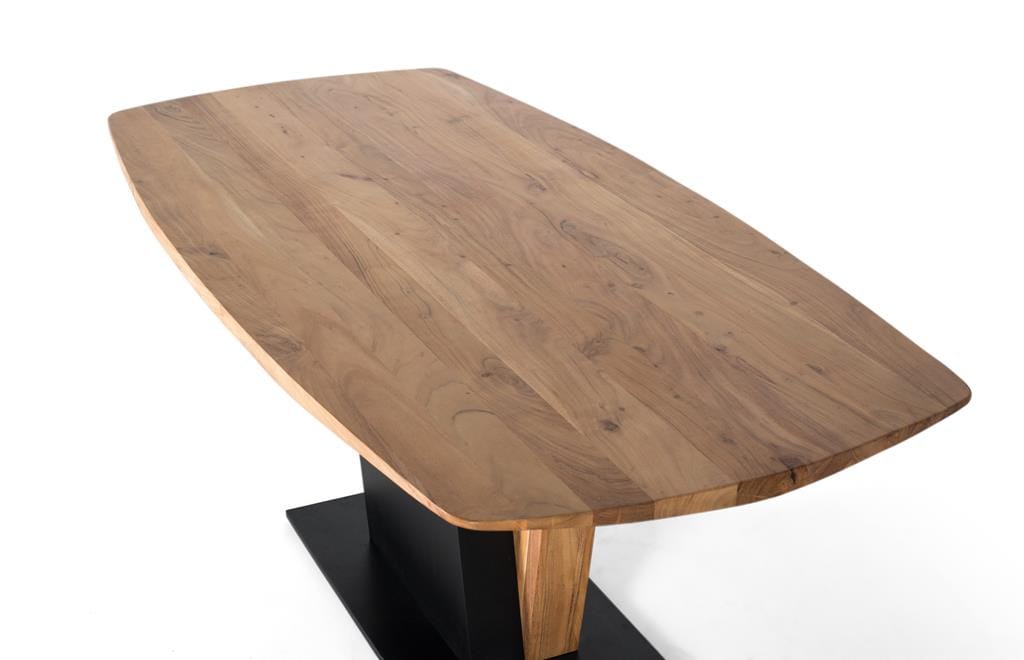 Mesa de comedor fabricada en madera de acacia y metal. Al ser madera matural puede venir con sus nudos y vetas originales. Incluye tacos regulables que impiden desplazamientos y protegen el suelo contra ralladuras. Grosor de la tapa 3,5cm.