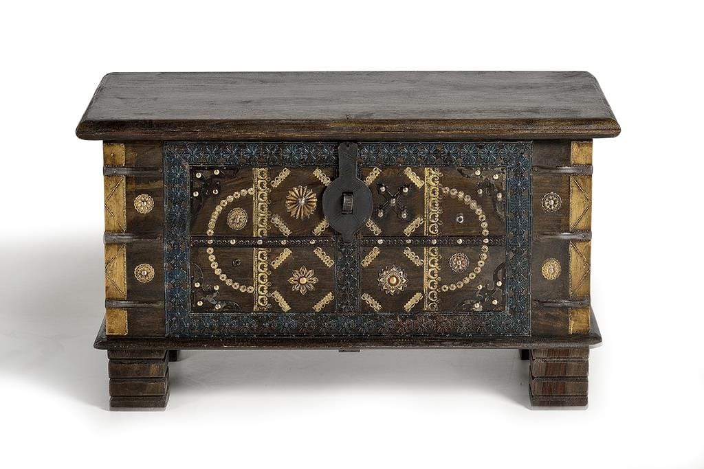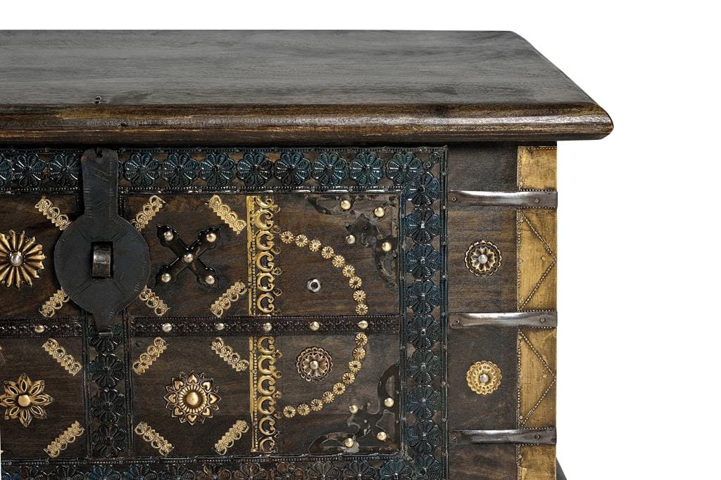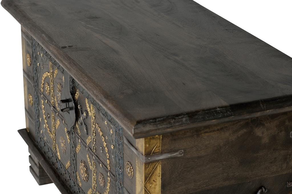 BAUL EN MADERA DE MANGO, CON APERTURA SUPERIOR, GRAN CAPACIDAD DE ALMACENAJE. DETALLES DEL BAUL EN METAL Y BRONCE. – ALTURA PATAS: 10 CM