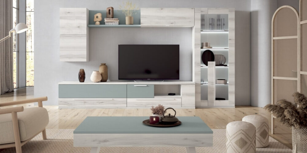 Mueble de salón modelo Cubika de 357cm. Mueble modular con opción de añadir o quitar piezas y cambiar tanto medidas como colores para hacer una composición única a tu gusto.