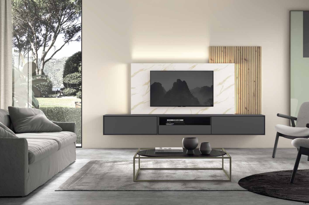 Mueble de salón colgado modelo Iris de Rosamor de 277cm con panel TV y panel de palilleria.