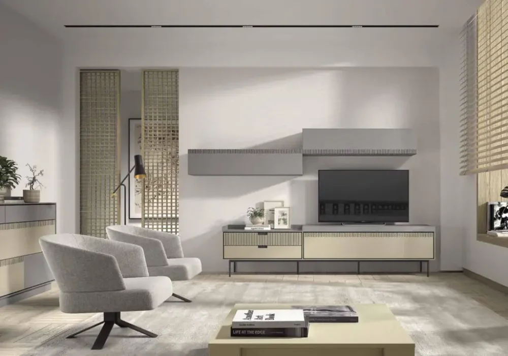 Mueble de salón modelo Iris de Rosamor con pata metálica de 290cm.