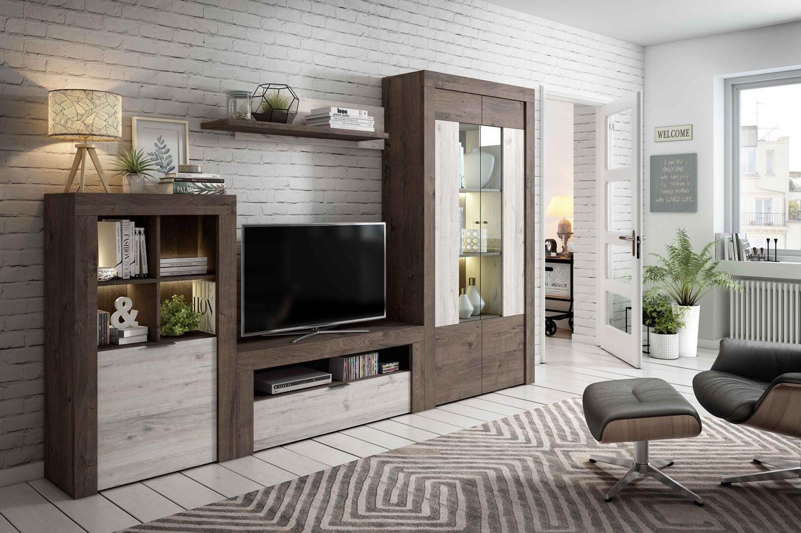 Mueble de salón contemporáneo de 296cm. Mueble modular con opción de añadir o quitar piezas y cambiar tanto medidas como colores para hacer una composición única a tu gusto.