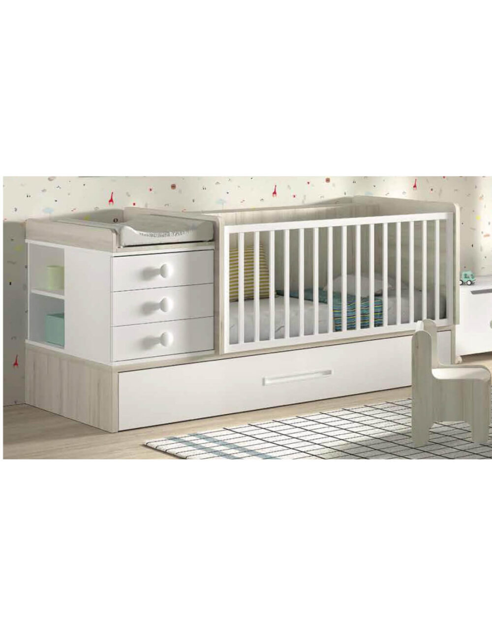 Cuna convertible de Glicerio Chaves perfecta para aprovechar su vida útil en las diferentes etapas de tu bebé. Desde los primeros meses podremos usarla como una cuna de 140×70 con su cambiador, su cajonera y su estantería para poder guardar tanto su ropa como pañales, cremas, etc. Además dispone de una cama nido extraíble por si en algún momento es necesario quedarse a dormir con él. Ésta opción podría cambiarse por cajones para guardar en vez de la cama nido.