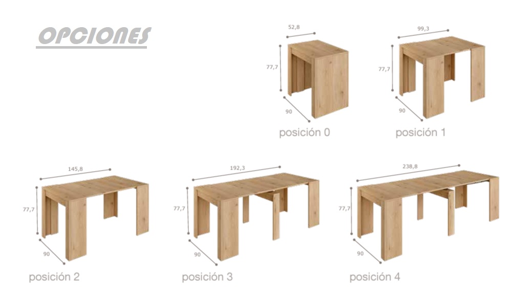 Mesa consola extensible con guías metálicas añadiendo tableros para poder adaptarnos a diferentes situaciones pudiendo tener una mesa de hasta 5 medidas de largo diferentes