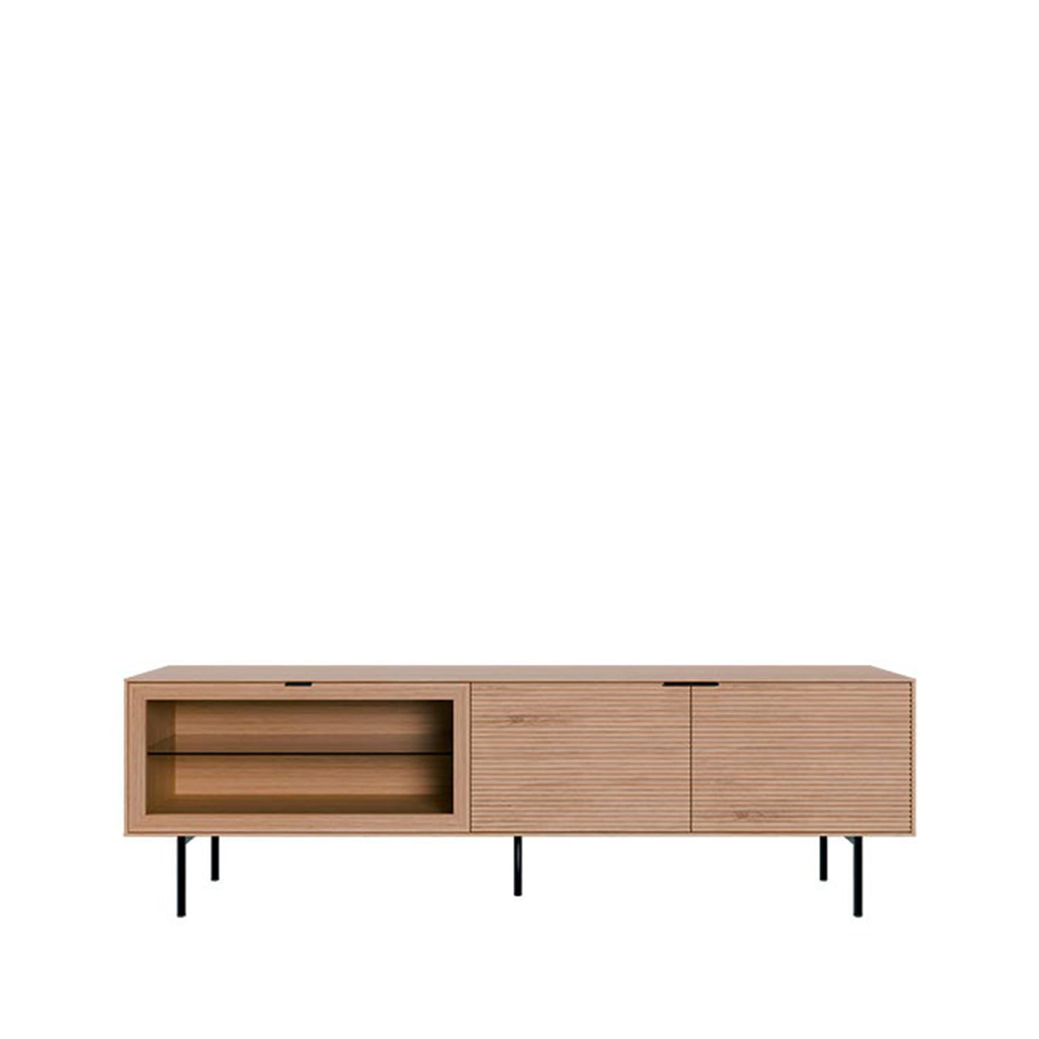 El mueble de TV TULSA de 180 cm destaca por su diseño equilibrado y su cuidada combinación de materiales. Equipado con dos puertas de madera y una puerta abatible de cristal, permite organizar con discreción y mostrar lo justo, ideal para equipos multimedia.