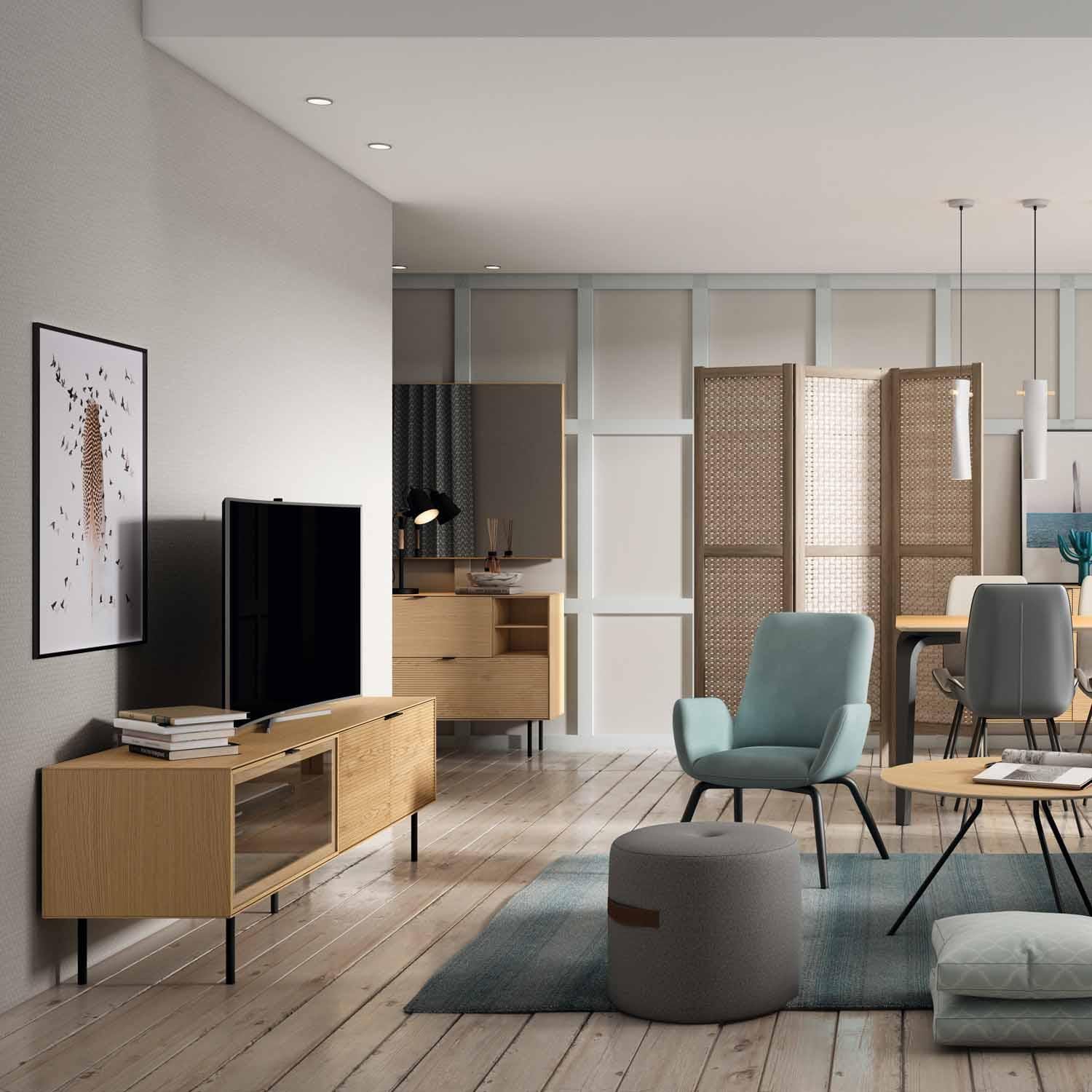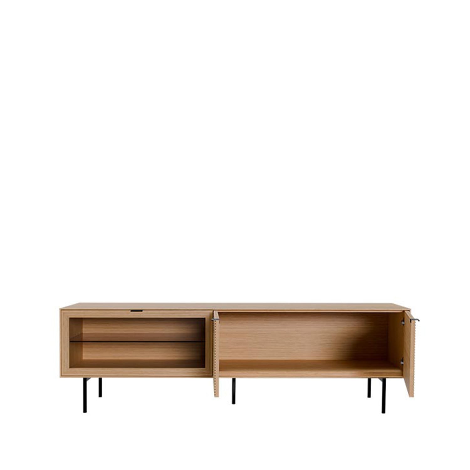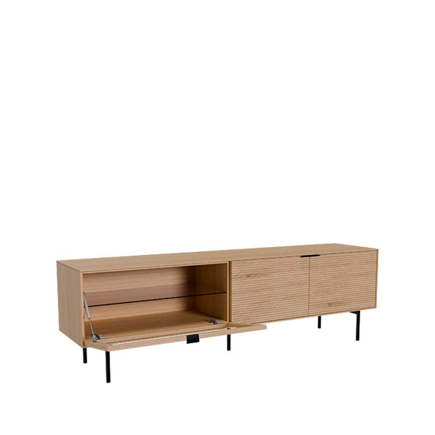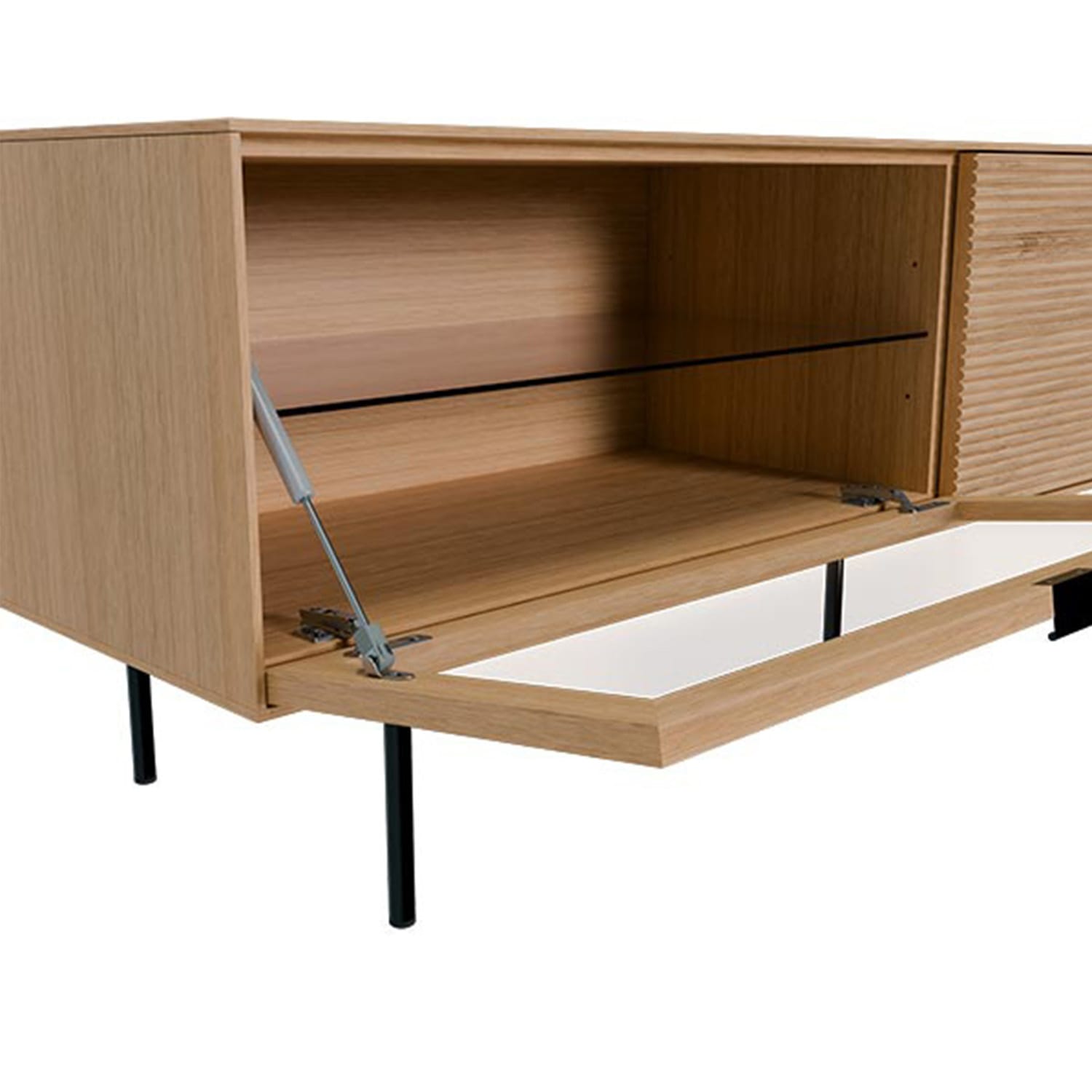 La estructura en chapa de roble y los frentes en madera maciza rayada aportan textura y un aire natural muy actual. El conjunto se completa con patas metálicas negras, tiradores a juego y sistema soft closing, ofreciendo una estética elegante sin renunciar a la funcionalidad. Una pieza pensada para salones que valoran el detalle.