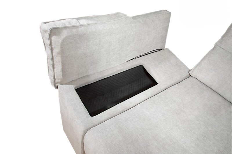 Sofá chaislong extraíble con ruedas al suelo tipo carro con brazo arcón extraíble y arcón en el chaislong para poder tener almacenaje, así se podrá usar como una cama en momentos puntuales.