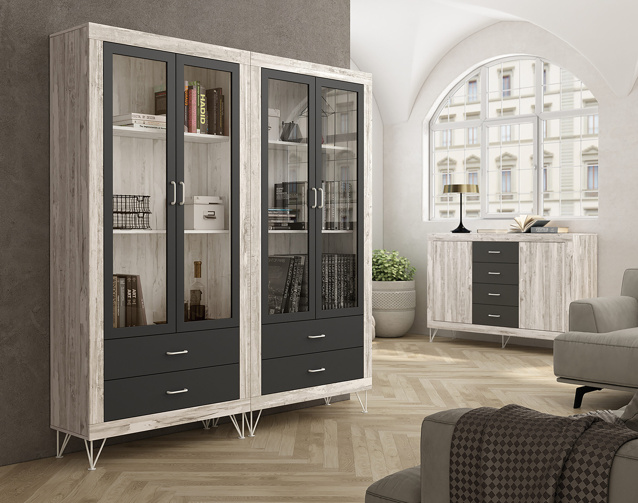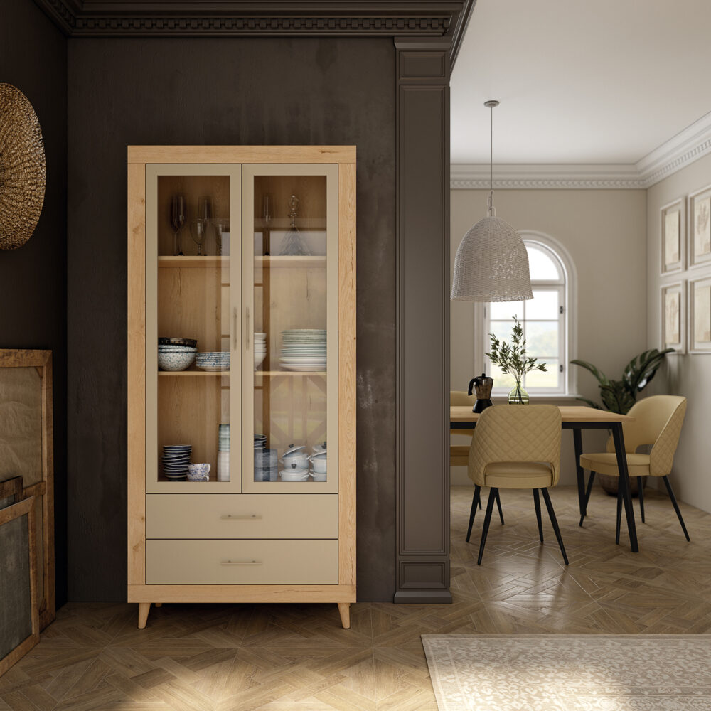 Vitrina de 2 puertas de cristal y 2 cajones con patas