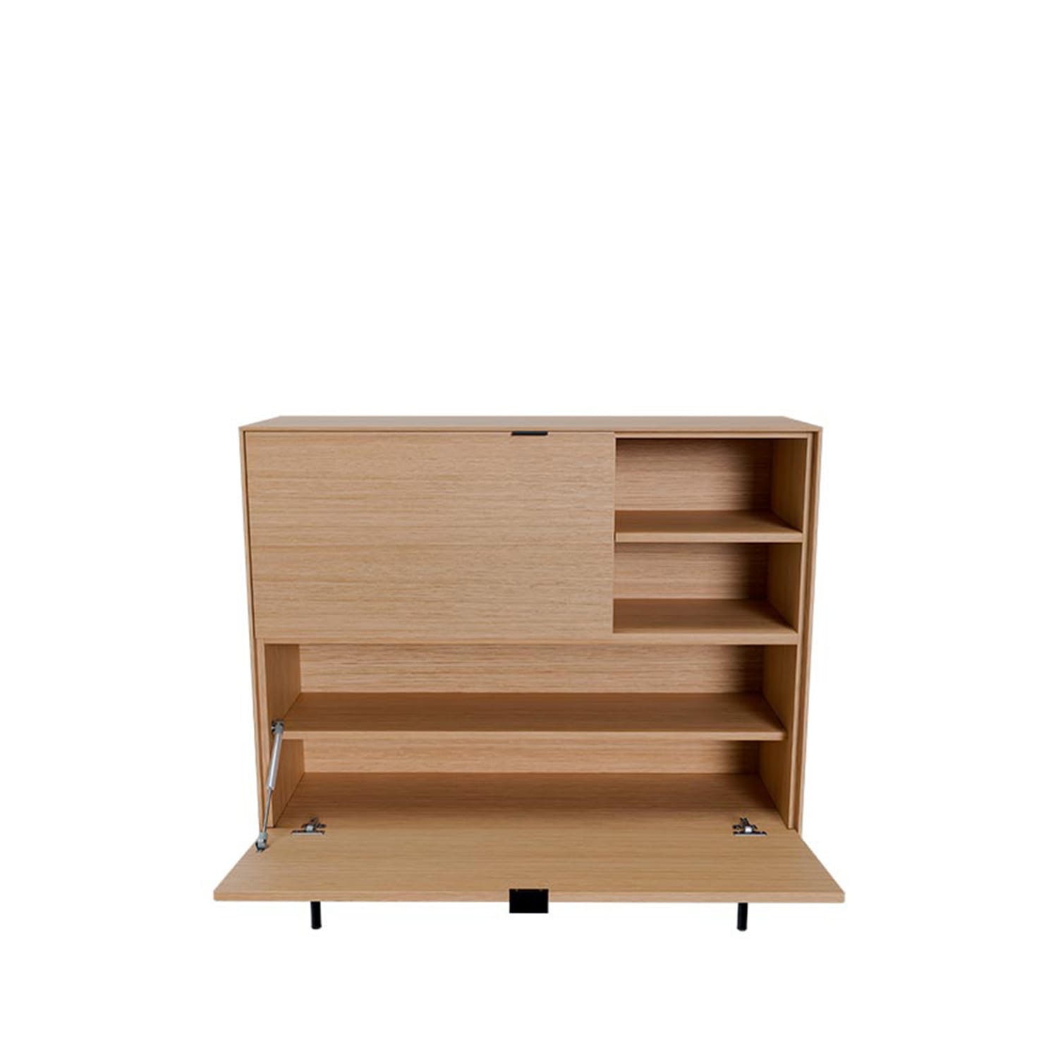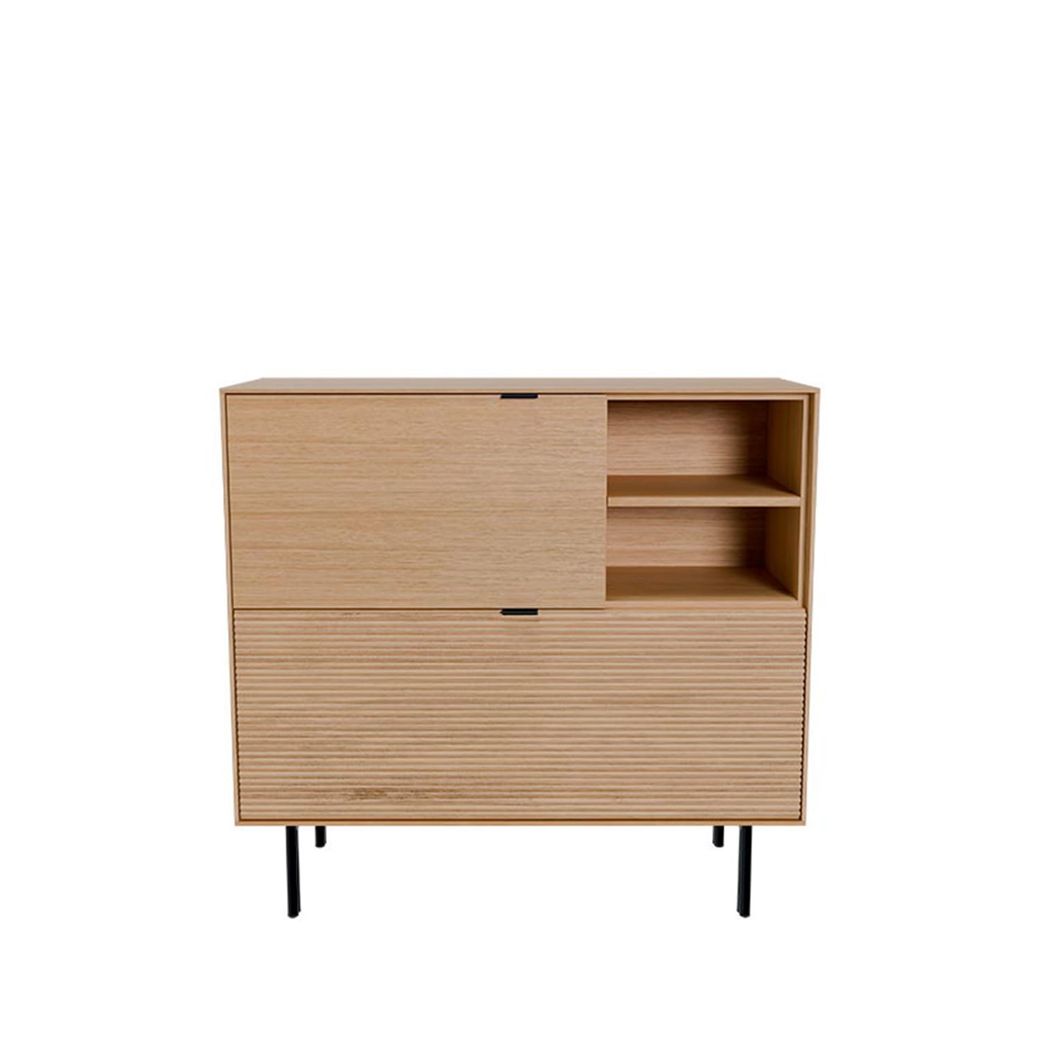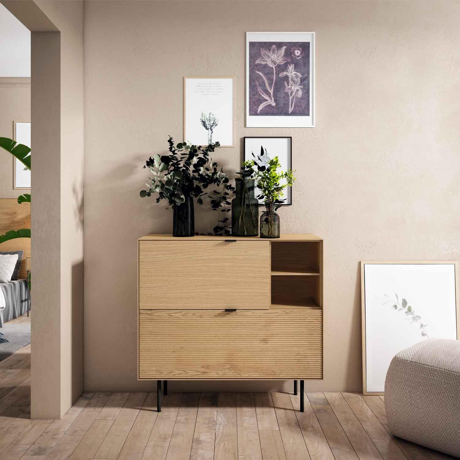 Puertas y cajones en madera maciza de roble rayado (en frontal) y con chapa de roble natural (en resto)
